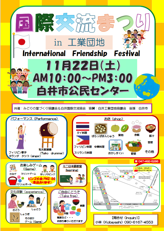 外国人と日本人の相互理解を図り、友好な関係を築くために、いろいろな体験や学習をしながら楽しく過ごす交流会「国際交流まつりin工業団地」を白井国際交流協会と共催で開催します!